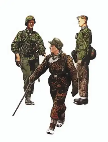 Пятнистая блуза испытывалась в войсках СС еще в 1938 г. Впоследствии камуфляжными рубахами и куртками обеспечивались боевые части всех родов войск. Это поистине новаторское решение одежды оказало влияние на униформу многих армий. Блуза-анорак надевалась на обмундирование, вертикальные прорези с листочками открывали доступ к карманам куртки. В нижней части рукавов имелись вздержки со шнурками или резинками, хлястики; по талии делались кулиски со шнуром. Передний разрез шнуровался от середины груди до горла, воротник заменял капюшон со шнуровой затяжкой. Подол часто подворачивался. Затем на юбке блузы появились просторные карманы с клапанами на пуговицах; нагрудные прорези также прикрылись клапанами. В поздних моделях - спереди и сзади на плечах, а также на рукавах - нашивались лесенкой шлевки для крепления веток. Армейские камуфляжные блузы шили из палаточной ткани с "оскольчатым" или "размытым" рисунком, с бежевой либо белой изнанкой. В войсках СС существовало около 7 разновидностей раскраски, причем каждая выполнялась в светлой и темной гаммах с обеих сторон полотна. Чаще всего это была россыпь небольших пятен округлой или неправильной формы, с четким контуром или размытых; в целом рисунок напоминал ковер из опавших листьев на фоне земли или травы. Такая же мелкопятнистая ткань шла на эсэсовские плащ-палатки. В войсках СС часто с серо-зеленой полевой курткой сочетались камуфлированные хлопчатобумажные брюки, надеваемые поверх суконных или вместо них, - они входили в полный масккостюм с распашной курткой. У штанов были встречный клапан с тремя пуговицами на гульфике, скошенные клапаны карманов, несколько смещенные вперед и застегивающиеся на пуговицу, а по талии и низкам штанин - затяжные тесемки. Куртка из этого костюма походила на полевой китель, но с открытым воротником (существовали и другие варианты), знаки различия СС на него не нашивались. Допускались съемные погоны и нарукавный орел. В жару камуфляжный костюм надевался на нижнее белье. После оккупации Италии германскими войсками эсэсовцы воспользовались итальянской маскировочной тканью с трехцветным крупнопятнистым рисунком. Такой камуфляж встречался и на Восточном фронте, в основном в дивизиях, прибывших с Запада. Для лета разработали полевую куртку с "оскольчатым" рисунком, аналогичную по покрою суконной. Ее носили с обычными погонами, петлицами и наградными знаками преимущественно офицеры армии. Только с пристежными погонами использовался укороченный вариант - в эсэсовском мелкопятнистом камуфляже и с нашивными неглубокими карманами, несколько декоративный вид, которых подчеркивали байтовые складки. Обе разновидности носили с расстегнутым воротником и отвернутыми углами бортов. Под куртку надевали серо-зеленую верхнюю хлопчатобумажную рубашку, иногда даже с галстуком, либо трикотажную, без карманов. Вместо нее использовался шелковый или трикотажный шарфик - одноцветный или в горошек, полоску, зигзаг. Наряду с пятнистыми штанами, с камуфлированной курткой носили и обычные форменные брюки: серые бриджи, прямые цвета “фельдграу”, черные танкистские. Часто поверх маскировочной блузы выпускался воротник полевой куртки. Если в армии знаки различия на нем позволяли определить лишь категорию чина, то эсэсовские - чин, а в ряде случаев и дивизию.