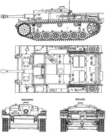 StuG III Ausf.E - Эта САУ стала последней модификацией StuG III, вооруженной короткоствольным 75-мм орудием. Выпускалась с сентября 1941 по март 1942 года. Она проектировалась в качестве командирской машины с двумя радиостанциями, Для их размещения предназначались два бронированных ящика увеличенного объема на левой и правой надгусеничных полках. Однако только правый ящик был полностью занят радиооборудованием, часть объема левого ящика использовали для размещения боеукладки на шесть выстрелов. Таким образом, боекомплект машины возрос до 50 выстрелов. Наклонные бортовые бронелисты были ликвидированы. Толщину бортов рубки довели до 30 мм.