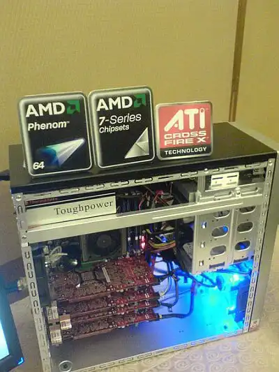 Да! Четыре карты, а проц отстойный АМДшный четырёхядерник! Который слабее самой младшей модели от Интела! Да ещё и не гонится совсем! И толку от такой машины!? Как всегда вся заноза будет крыться именно в проце!!! На самом деле фотографии сделаны только для демонстрации, что такое в принципе возможно!