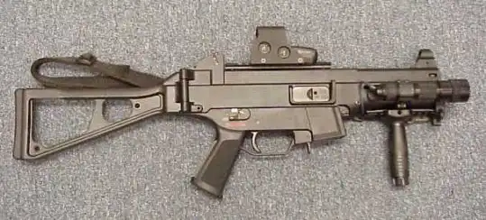 Пистолет-пулемет Heckler und Koch UMP-40 с дополнительным оборудованием: коллиматорным прицелом и тактическим фонарем на цевье