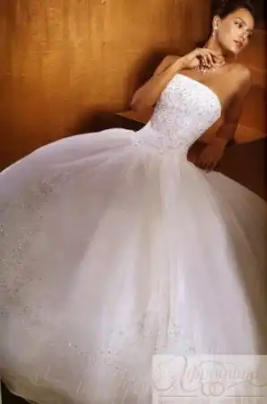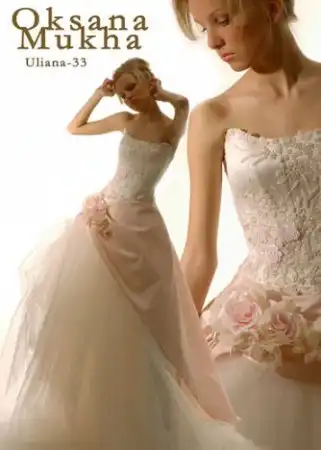 Это платье,конечно,красивое.Цена тоже средняя,в районе 30 тысяч рублей.Но наличие тяжелого шлейфа и обилие разных тканей мешает нормально двигаться.И модный сейчас "английский" верх "благодаря" твердому кружеву очень сильно колется.А жаль=((