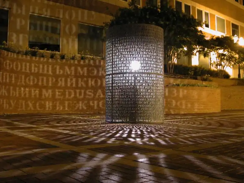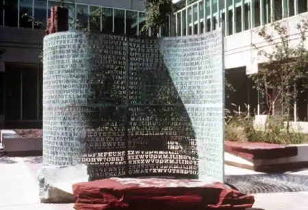 Две криптоскульптуры от художника Джеймса Санборна. Первая стоит около штаб-квартиры ЦРУ (часть текста до сих пор не расшифрована и дико злит разведчиков), вторая (с выдержками из реальных шифровок КГБ) — в университете Северной Каролины.