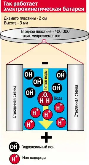 В изобретении реализован удивительный феномен - так называемый двойной электрический слой. Обнаружилось: если вода течет по каналу диаметром в 10 микрон с непроводящими стенками, то на одном его конце возникает положительный заряд, на другом - отрицательный. Иными словами, для производства электричества не нужно ничего, кроме микроскопических трубочек и воды. Например, дождевой.