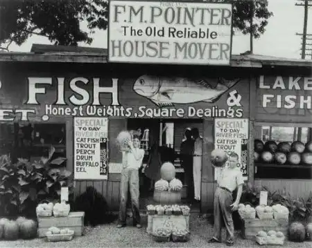 Изображение, сделанное всего за несколько лет до Великой Депрессии в США. Магазины в Алабаме рядом с железной дорогой переполнены рыбой, овощами и фруктами…