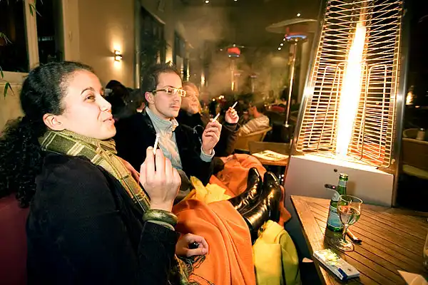 Разумеется, новый закон не был принят со всеобщим воодушевлением. Курильщики и представители бизнеса, напрямую связанного с досугом граждан, протестуют против запрета на курение в общественных местах. А некоторые, как владелец ресторана, изображенный на фотографии, предлагают альтернативные способы насладиться сигаретой, не выходя из помещения.