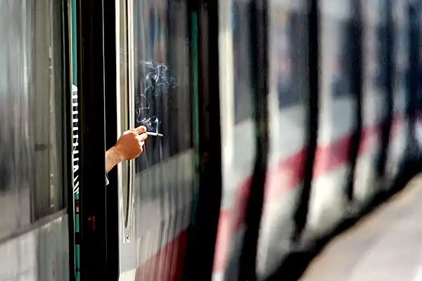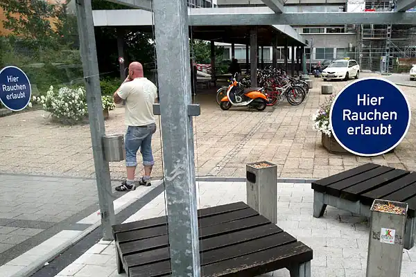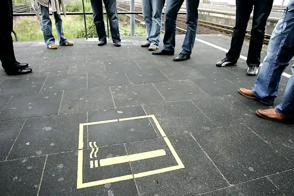 В Германии по законодательству на железнодорожных станциях курение разрешено только в специальных зонах, которые обведены желтой линией — «островках курения».