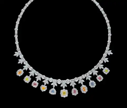 Следующее колье уникально тем, что все драгоценности в нем представлены в естественных тонах. Белоснежное ожерелье состоит из алмазов, основой для которых служит платина и золото. Но о цене шедевра ничего не известно.
