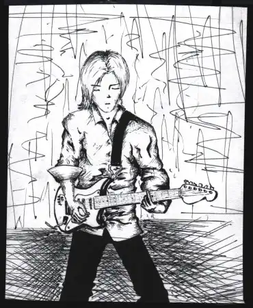 На фотке ниже он нарисовал меня с гитарой, когда ее у меня не было еще. На оригинальной картинке на гитаре чуть позже подрисовали символ Инь Ян. Года через 2 года я купил гитару с рук, без всяких левых мыслей(на гитаре был наклеен значок Инь Ян). Как же я был удивлен позже, рассматривая старые картинки, что гитара нарисованная за 2 года до покупки точь-в-точь такая же, с символом Инь Ян точно на том же месте, что и на настоящей гитаре
