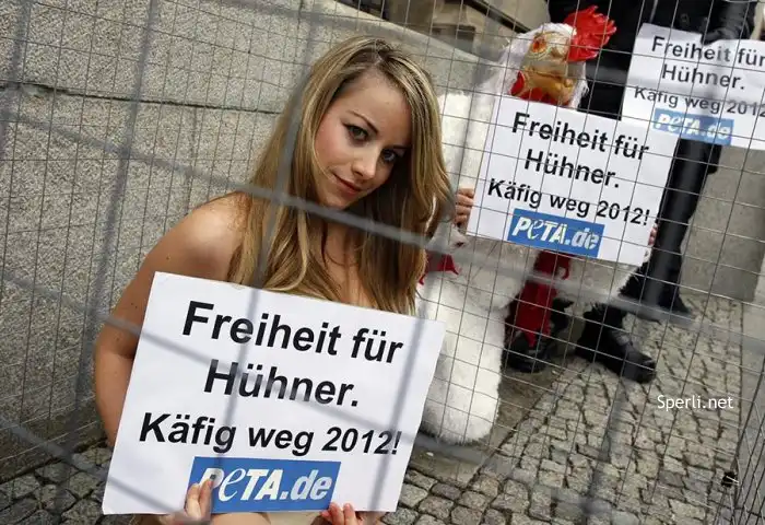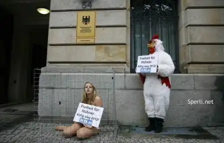 Кажется они вообще тронулись ... На этот раз – в Берлине. Сегодня у здания Министерства сельского хозяйства появилась клетка, с сидящей в ней актрисой Kати Пфлегар Рядом с ней стоял активист организации PETA в костюме курицы. Представьте, на этот раз парочка протестовала против содержания на птицефабриках куриц в клетках.