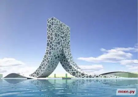 Первое здание, выходящее из воды, это спортивный и культурно-досуговый центр. Второе здание, выходящее из земли, это общественный и конференц центр.В месте пересечения этих зданий высоко над уровнем земли - начинается отель на 1000 номеров. Спроектировано оно в форме иероглифа «ren», что в переводе означает "люди".