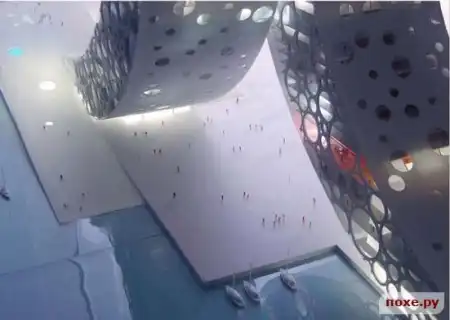 Но и это еще не все: если смотреть с фасада, то просвет между зданиями напоминает иероглиф «огонь», вид сверху похож на иероглиф «змея», волнистая крыша в основании сооружения символически говорит о «воде», а круглые окна – о «металле». В общем, одни символы.