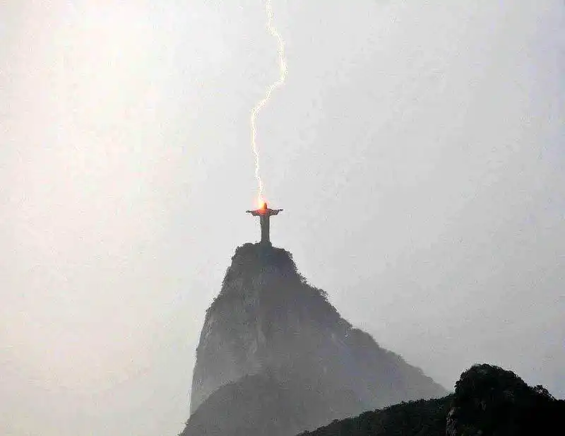 Воскресный шторм, прошедший по Рио-Де-Жанейро, потрепал деревья и крыши, но статую Христа не тронул, а вот молния прямым попаданием попала в неё.Получить такой редкий кадр - 1 шанс на миллион.