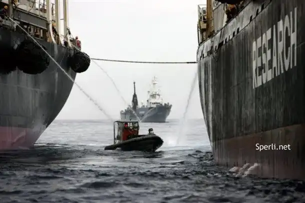 Активисты попытались помешать процессу заправки китобойного судна Nisshin Maru заправщиком Oriental Bluebird. Как это обычно бывает, гринписовцы подверглись атаке китобоев – их поливали водой из шлангов.