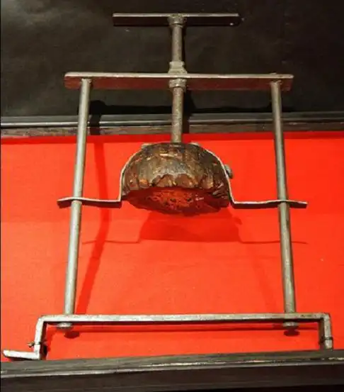 Это средневековое устройство, надо отметить, высоко ценилось, особенно на территории северной Германии. Его функция была довольно проста: подбородок жертвы помещали на деревянную или железную опору, а крышка устройства навинчивалась на голову жертвы. Сначала раздавленными оказывались зубы и челюсти, затем, поскольку давление нарастало, ткани мозга начинали вытекать из черепа. По прошествии времени, этот инструмент утратил свое значение как орудие убийства и приобрел широкое распространение как орудие пытки. В некоторых странах Латинской Америки очень похожее приспособление используется и до сих пор. Несмотря на то, что и крышка устройства, и нижняя опора выложены мягким материалом, который не оставляет никаких следов на жертве, приспособление приводит заключенного в состояние «готовности к сотрудничеству» уже после нескольких поворотов винта.