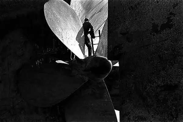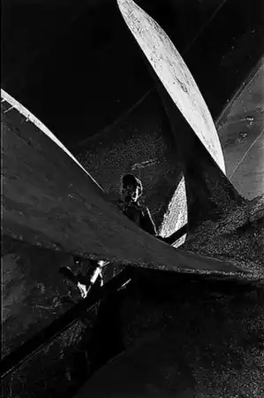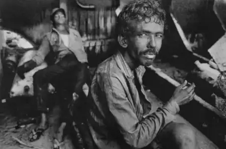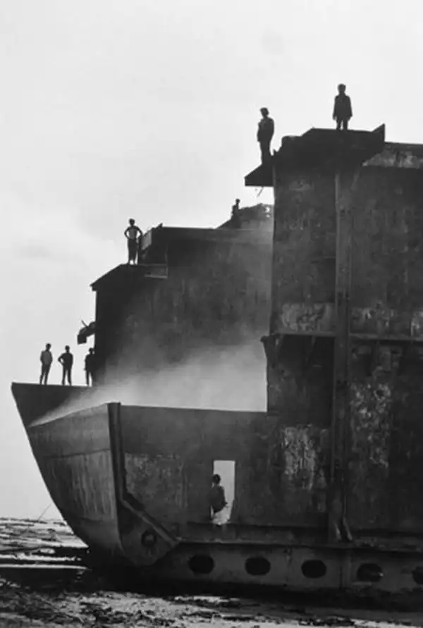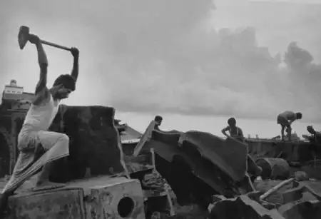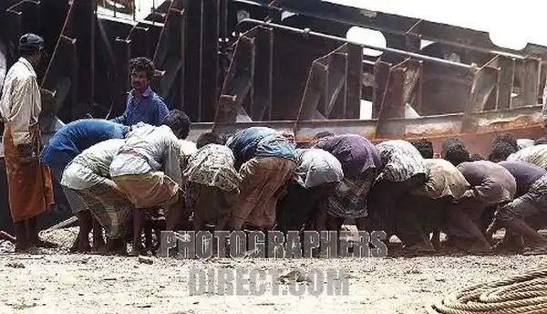 "...Используя только паяльные лампы, кувалды и клинья они вырезают огромные куски обшивки. После того, как эти фрагменты рушатся вводу наподобие отколовшихся кусков ледника, их волокут на берег и режут на мелкие части, весящие сотни фунтов. Их переносят на грузовики команды рабочих, поющих ритмичные песни, поскольку перенос очень тяжелых толстых стальных пластин требует идеальной слаженности действий. Металл будет продан с огромной выгодой для владельцев, которые живут в роскошных особняках в городе. ...Разделка судна продолжается с 7:00 до 23.00 одной командой рабочих с двумя получасовыми перерывами, и часом на завтрак (ужинают они после того, как вернутся домой в 23.00). Итого - 14 часов в день, 6-1/2 дневная рабочая неделя (полдня в пятницу свободно, согласно требованиям ислама). Рабочим платят 1.25 $ в день"