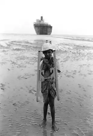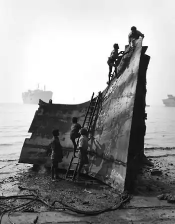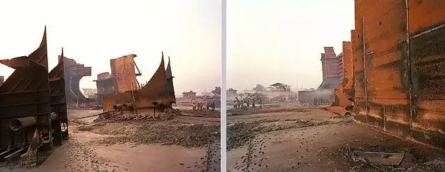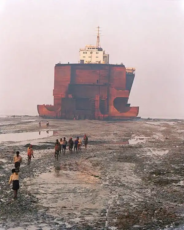"Большинство судов мира заканчивает свою жизнь в южной Азии. Читтагонг, второй по величине город в Бангладеш, стал одним из главных центров демонтажа крупных судов. Площадки для демонтажа занимают приблизительно десять километров плоского песчаного берега. Работа ведется почти полностью голыми руками в чрезвычайно трудных условиях. Тысячи людей вручную демонтируют металлические корпуса, выводят кабели и извлекают заклепки. Большинство этого материала вновь перерабатывается в строительную сталь".