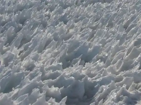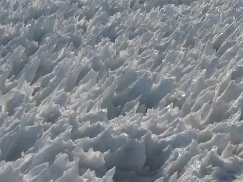 Поначалу, солнце вызывает таяние снегов и вызывает появление впадин на поверхности снега…Затем таяние во впадине ускоряется, оставляя пики льда…Пики «вырастают» от нескольких сантиметров до 5 метров в высоту…