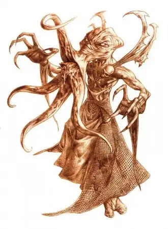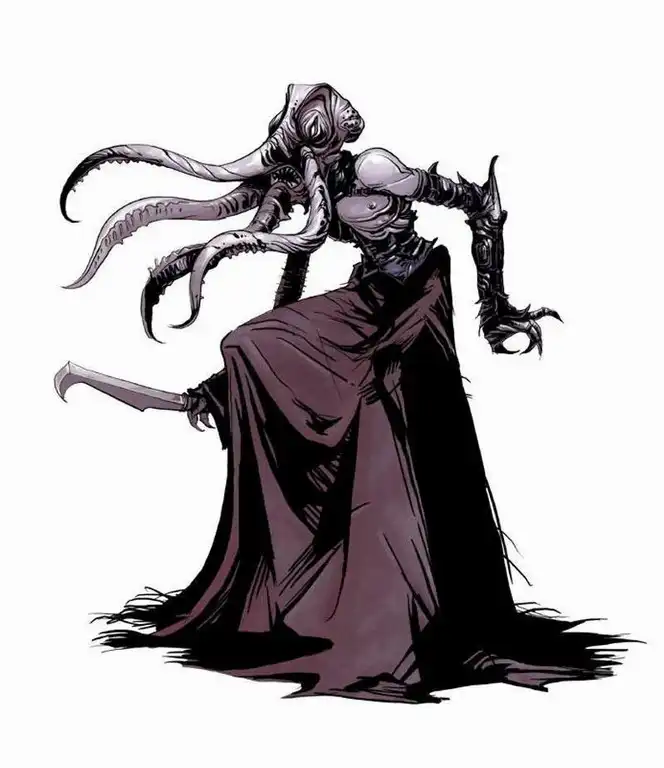 Еще хуже клевещут те, что изображают иллитидов полуголыми. Иллитид всегда опрятен и пристоен. Он наряжается в мантию-платье благородных темных цветов, с непременным стоячим воротником наподобие тех, что носила королева Елизавета Великая. Если ему предстоит общение с низшими существами, вроде нас с вами — то из уважения к гуманоидам он украшает свое платье стилизованным черепом.