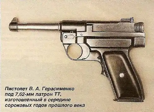 Кроме безгильзовых пистолетов в фондах музея име-ются 9-мм пистолет под патрон 9x18 ПМ, а также 7,62-мм пистолет Герасименко под патрон ТТ, но он вполне обыкновенен по конструкции и замечателен лишь надписью «XXX лет Великого Октября» на рамке. Кстати, на безгильзовых пистолетах тоже имеется лозунг - «50 лет СССР». Думаю, что такая демонстрация лояльности власти была жизненно необходима для обеспечения самой возможности работы с оружием на непрофильном предприятии.