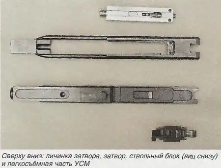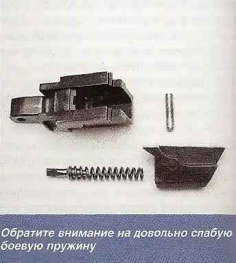 При производстве выстрела с невзведённым курком задействуется тяга, соединяющая спусковой крючок с курком, расположенная внутри рамки пистолета (справа).