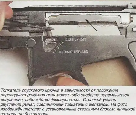 В автоматическом режиме при нажатом спуске толкатель, нажав на рычаг, жёстко фиксируется в верхнем по-ложении. При приходе затвора в переднее положение рычаг натыкается на толкатель и его передняя часть поднимается - шептало опускается, происходит выстрел.