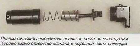 Для обеспечения возможности эффективной прицельной стрельбы в автоматическом режиме в конструкцию введён пневматический замедлитель, тормозящий затвор при его движении в крайнее переднее положение.