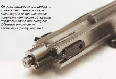 Оригинально устроен пневматический замедлитель, подтормаживающий затвор при накате, что позволяет вернуться пистолету на линию прицеливания при стрельбе очередями.