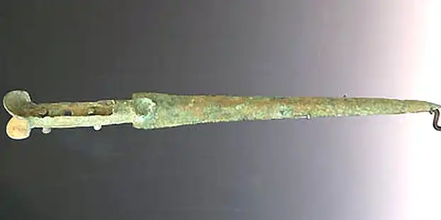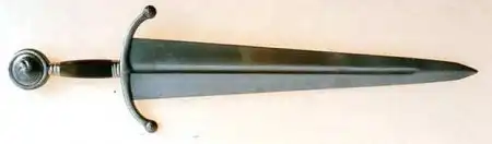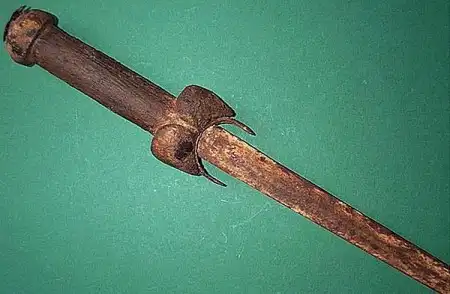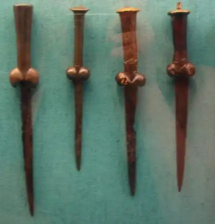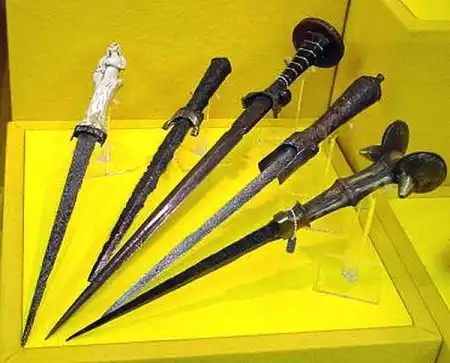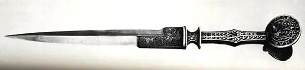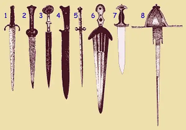 3. «Ушастый» кинжал, свое имя получил от двух дисков, образующих головку. Обычно богато украшен. 1400—1550 гг. Дальше смотрим ещё на "ушастых".