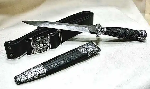 Были ещё такие хитрые леворучные даги, назывались спрингклинге. При нажатии куда надо, выскакивали дополнительные лезвия. Смотрим: