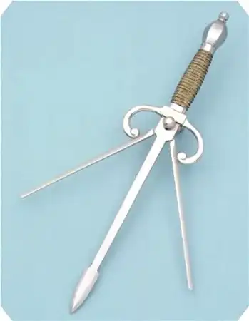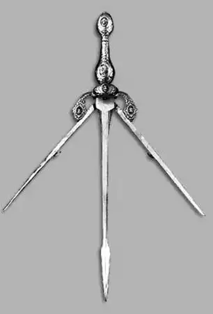 8. Маин гауче, дага, кинжал для левой руки. Здесь представлена его развитая форма с ажурным треугольным щитком гарды. Использовался в паре с рапирой на дуэлях.