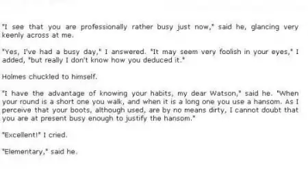 Это всего лишь всемирно известный лексический литературный шаблон «Elementary, (My Dear) Watson». Но в текстах Конан Дойля такой фразы не было. Был отрывок из рассказа «The Crooked Man», в котором Холмс произносит-таки часть этой фразы: ««Elementary» (Элементарно). Вот как он выглядит.