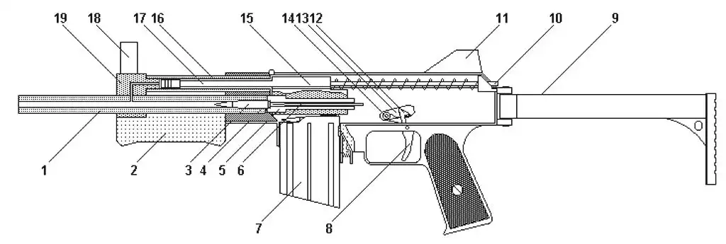 9 - складной плечевой упор 19 - газовая камора