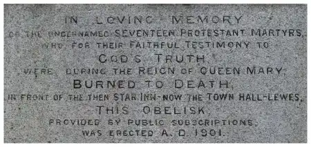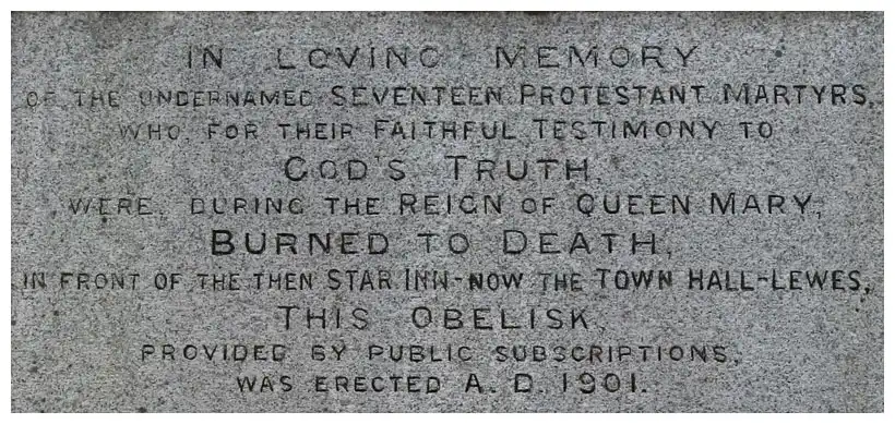Для тех кто не силен в английском - надпись: "Обелиск в память о 17ти сожженных заживо мученниках во времена правления королевы Марии...".