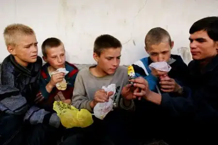 Но главное — чтобы были «бабки» на клей. Если есть голубой «Момент», день прожит не зря. Для большинства «генералов песчаных карьеров» клей — это истинный хлеб насущный, поскольку он заполняет пустоту — тела ли, души ли. А «дышат клей» следующим образом: наливают его в пакет и подносят ко рту и носу, вдыхая пар, пока не «поймают глюк».