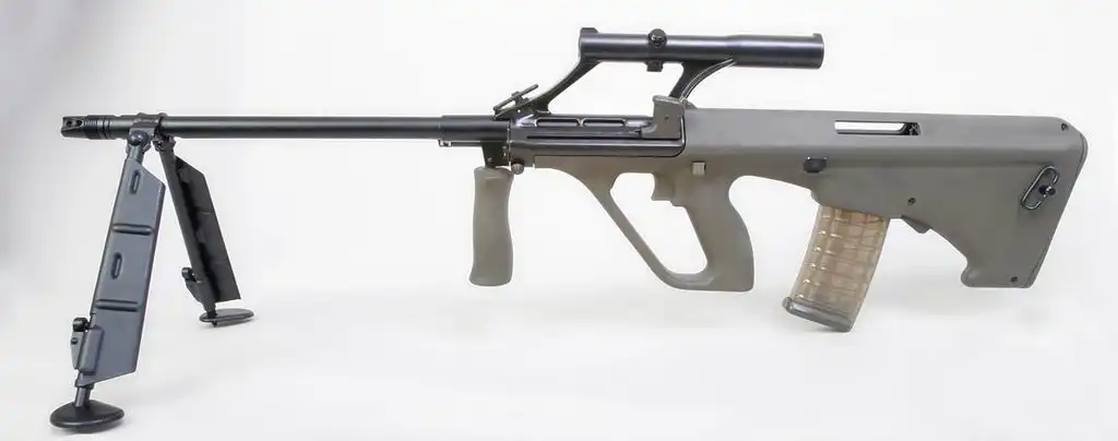 Ручной пулемет, созданный на базе всемирно известной австрийской штурмовой винтовки Steyr AUG. Отличается от нее более длинным и тяжелым стволом и наличием складных сошек. Конструкция «bull-pap» со сдвинутым к прикладу центром тяжести позволяет вести прицельный огонь даже длинными очередями.