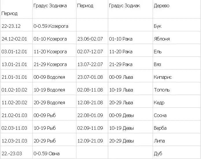 Поэтому в выборе своего дерева лучше ориентироваться не на календарную дату рождения, а на градус Солнца, который легко можно найти в своем гороскопе. Солнце возвращается в тот же градус Зодиака в разные годы с небольшой поправкой. Так, что люди, родившиеся, например 11 апреля в один год могут иметь своим древесным знаком Рябину, а в другой - Клен. Вот один из вариантов этой типологии, но, повторяю, узнайте градус своего Солнца в гороскопе.