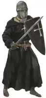 На рыцаре одет цельнотянутый шлем с отдельно сделанным наносником. Конструкция удерживается кожаными ремешками, застегиваемыми на пряжку у виска. Верхний слой одежды представляет собой широкую и просторную рясу-каппу из черной ткани с очень большим капюшоном. Ряса подпоясывается белым шнуром вокруг талии. Заметьте, что левая часть подола подобрана и расположена за ножнами так, чтобы оружие всегда можно было легко достать.
