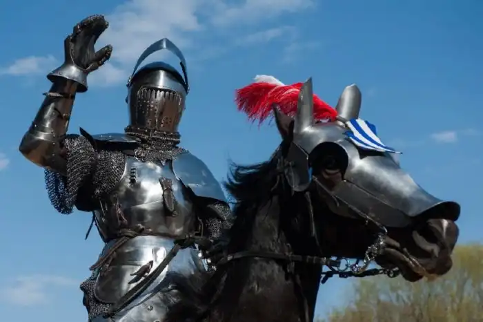 Темплиер (слева) надел набивной подшлемник "бурлет" (1), который надежно удерживает простой топхельм (2). Кольчужный доспех "хауберг" (3) носится поверх набивного поддоспешника "гамбезона", но под форменным сюрко Ордена (4) - белым с красным крестом на груди. Это свободное одеяние, длиной чуть ниже колен, имеет разрезы до талии спереди и сзади - для удобной езды верхом. Рыцарь в кольчужных чулках, с пристегнутыми шиповидными шпорами (5).