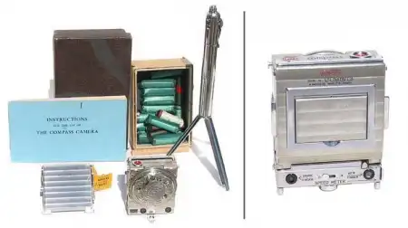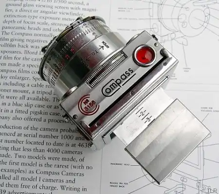 И это не хвастовство. Compass, оснащенный выдвижным объективом Kern 3,5/35 и секторным затвором с выдержками от 4,5 до 1/500 сек., имел встроенные фильтры, пузырьковый уровень, угловой видоискатель (помимо обычного видоискателя и дальномера), и продавался в комплекте с двумя насадками - стереоскопической и панорамной.