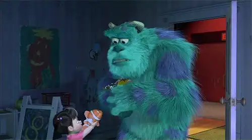 Затем Бу несет игрушки Салли. И вот он – главный сюрприз, милая маленькая девочка протягивает синему, покрытому шерстью монстру свою любимую игрушку. Совсем не случайно ее очертания один в один напоминают нам рыбу клоуна, которая играла главную роль в летней премьере 2003 студии Пиксар – «В поисках Немо».