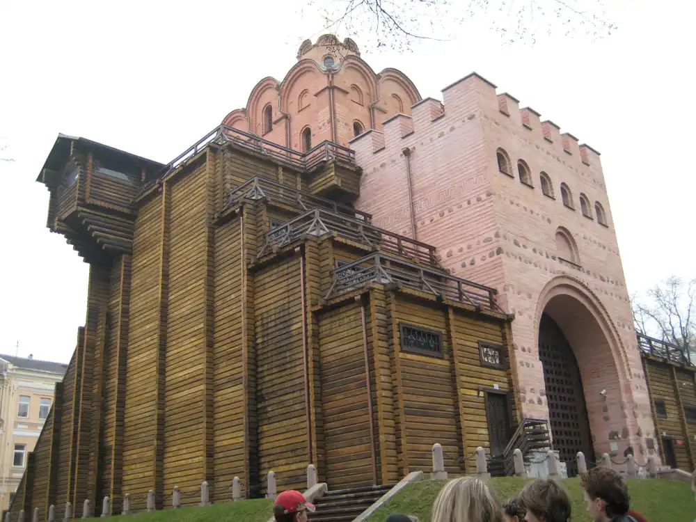 Это так называемые Золотые ворота Киева (если я ничего не путаю, точно не ручаюсь). Вернее то, что от них осталось. Дабы сохранить этот памятник архитектуры, его накрыли такой вот коробкой.