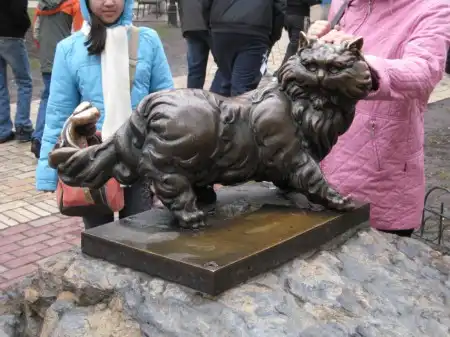 С этим котом связана целая история. Он был своего рода символом ресторана, который находится как раз напротив этого памятника. И люди шли туда, чтобы лишний раз его увидеть. Но, однажды, случился пожар, и кот погиб. Тогда хозяин завел другого, такого же кота. Но его спёрли во время прогулки. Потом третьего, теперь уже выгуливая на поводке. Но потом все-таки решил поставить такой вот памятник, от которого, кстати, не слишком умные люди оторвали маленькую птичку, которая должна сидеть рядом.