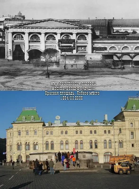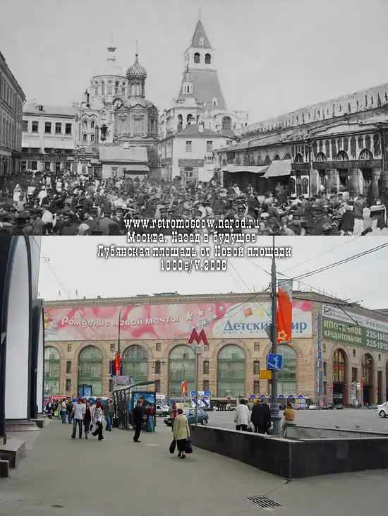 2006: слева - круглые арки перестроенного (1935) под один из выходов из метро "Лубянка" фасада графского дома (сам он надстроен в нач. XX в). В 1930е снесены все церкви и Владимирские ворота с Китай-городской стеной. Вдали, на углу Театрального проезда и Лубянской площади виден знаменитый магазин "Детский Мир" (1955-1957). В центре - гуляющие москвичи и гости столицы, троллейбусная остановка. Справа - подземный переход под Лубянской площадью с подземными киосками и другими входами в метрополитен, о чём информирует столбик с буквой "М".