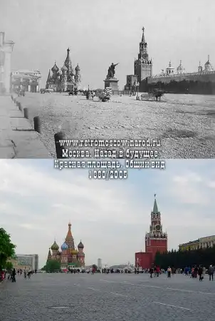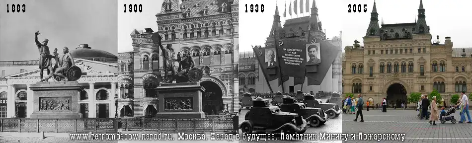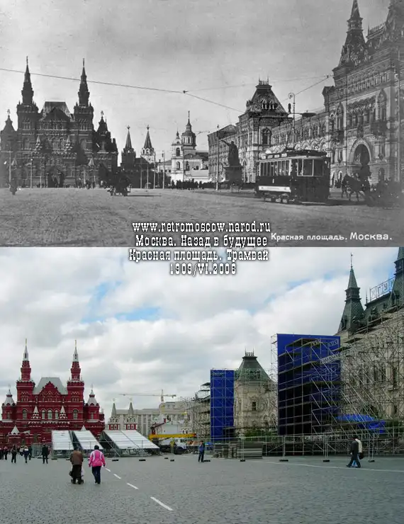 1909: Красная площадь после радикальной перестройки конца XIX в. с новейшим видом транспорта - электрическим трамваем, который идёт вдоль Верхних торговых рядов в сторону памятника Минину и Пожарскому. Перед Иверскими воротами (в центре) и Историческим музеем (слева) трамвай имел поворотную петлю. Левее Минина и Пожарского видна белая в классическом стиле колокольня "старого" Казанского собора, до перестройки 1920х и последующего его сноса, а за ней - "пожарная" каланча-башенка над бывшим Монетным двором, снесённая при СССР.