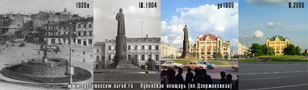 1964: площадь Дзержинского (с 1926) с памятником председателю ВЧК Ф.Э. Дзержинскому. 12м бронзовая статуя (1954, скульптор Е.Вучетич, архитектор Г.Захаров) стоит на месте фонтана, который был перенесён в Нескучный сад к зданию президиума Академии наук СССР (бывший царский Александровский дворец) на Ленинском проспекте. За "Железным Феликсом" пока ещё видны дома, за которыми спрятался Политехнический музей.