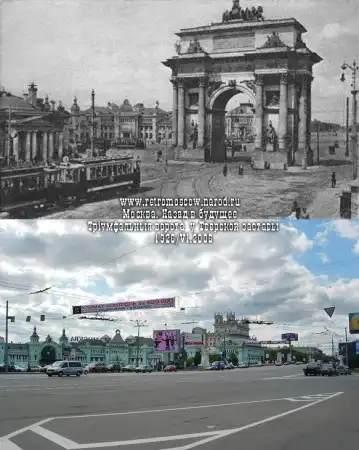 1926: Вид Тверской заставы с Триумфальными воротами (1829-1834) в центре. На заднем плане - Белорусско-Балтийский вокзал (будущий Белорусский). Слева - здание с колоннами - бывшие кордегардии (караульные помещения) "таможенников" при заставе, за которой город кончался. Слева - начало загородного Петербургского тракта, у моста-виадука через железнодорожное полотно. Через арку Триумфальных ворот проложены рельсы трамвая, следующего от Тверской в сторону окраины.