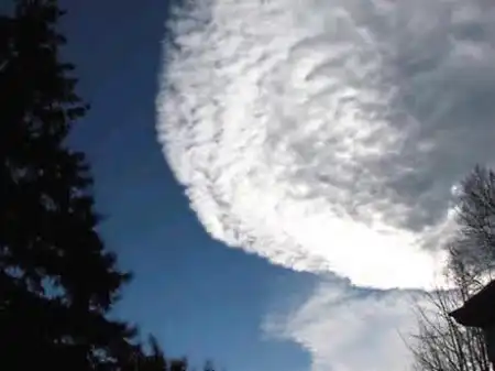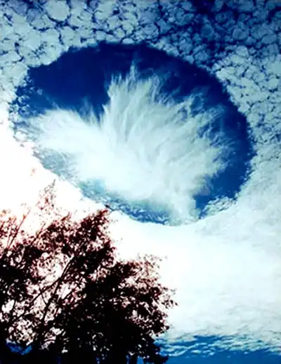 Есть гипотезы. Одна из них - отверстие образовалось в результате опадания ледяных кристаллов или тяжелых водяных капель, абсорбировших влагу из воздуха, образовавшихся в следе выхлопа пролетевшего самолета