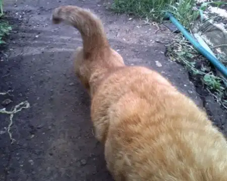 , которая непропорциональная с остальным телом, и из которой торчит хвост. Как я понял это кот или кошка. 2 фотография.