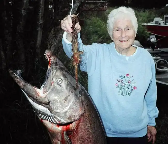 На фото одна и та же дама - Джанет Ларсен, пристрастившаяся к рыбалке. Фото сделаны в разное время, но они сделаны на Аляске, я точно знаю). Так вот пенсионерка тащит не по деЦки.
