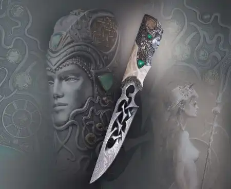 Дамаск, желтый и белый металлы, хризолит, хризопраз, бивень мамонта.